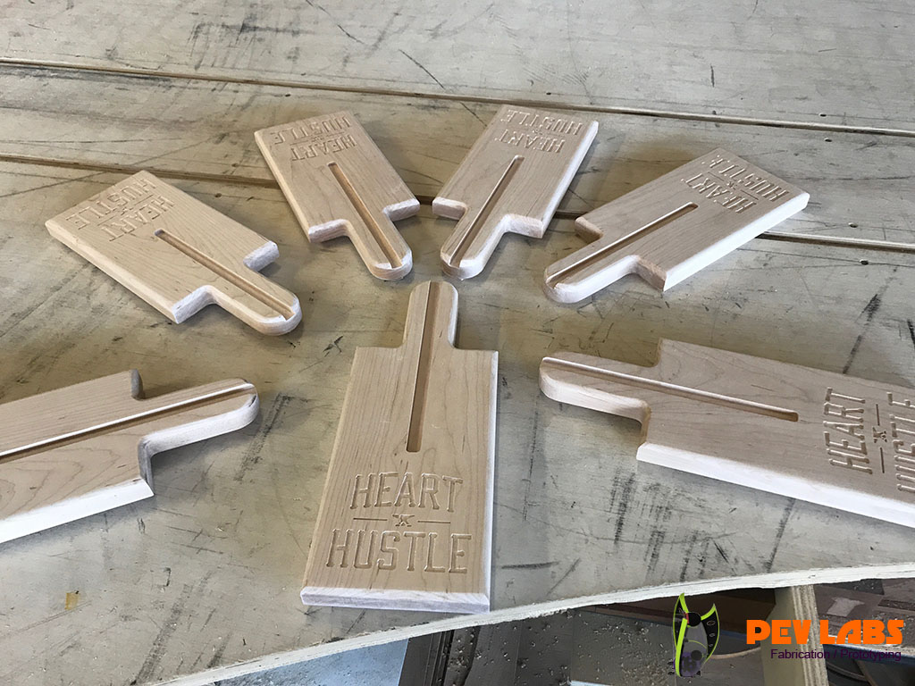 We designed and produced a few production runs of these Weightlifting Press Boards for Heart and Hustle Gym in Los Angles, CA. Project includes Product Design, CNC Milling, CNC Engraving and general Woodworking. These are made of solid hard maple grown and harvested from the eastern side of the United States. The way board presses are used in weightlifting is by Layering seven of the one inch thick boards on top each other during powerlifting training. After a set of reps are complete by the weight lifter one board is removed by the trainer which offers a new one inch lower sticking point. This is repeated until down to one of the boards. The power lifter will start with a full set of lumber between the barbell handle and the chest, working their way way down to one inch between the two. Bench Press Boards allows the lifter to focus on the lockout portion of the lift. The traditional press board method is to glue up five sets of blocks at one inch intervals. This method reduces cost by reducing material significantly and labor modestly. On the second iteration of this product we added the spine and groove to help guide the boards, or to keep them from sliding sideways. If you are in need of branded product production please reach out.