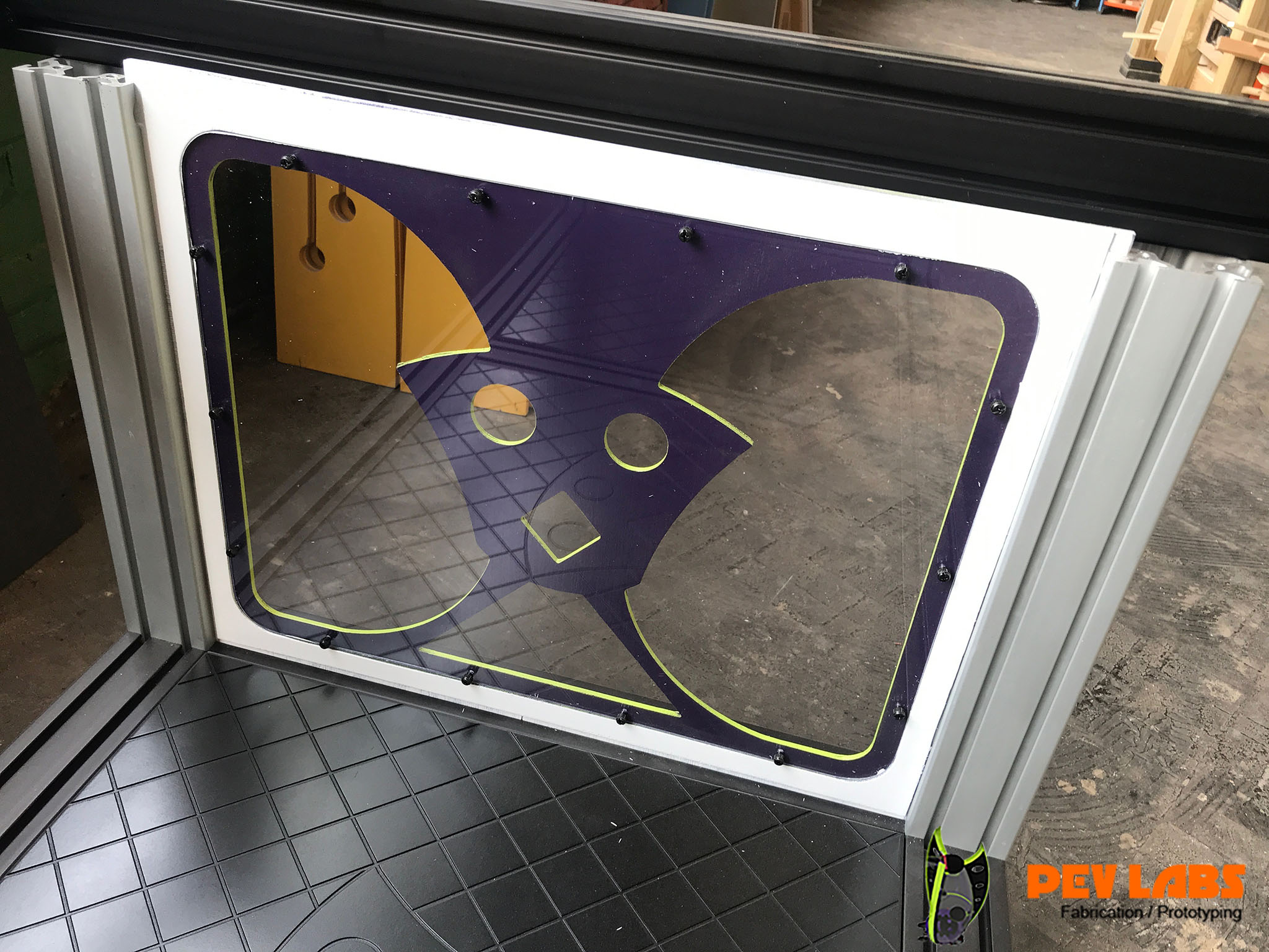 This DIY Laser Engraver project base cabinet will house some of the electronics and cooling system for the laser chassis that will sit a top. Custom shell panels shell are set in the frame grooves which is made of extruded aluminum. Panels of color cored MDF, Luan plywood and polycarbonate. We started in CAD by producing 3D renders from our 3D modeling program, Fusiion360. This DIY Laser Engraver project base frame is utilizing extruded aluminum stock with a mixture of natural and anodized black for a particular aesthetic what we like. The laser base cabinet has polycarbonate wall material inset in a uniquely designed framing support. The framing panels slide into the T-slot tracks prior to fastening the base top. The clear plastic panels can be removed at any time for servicing or expansion. Window panels are secured with anodized knurled thumbscrews. Floor panels have a unique CNC milled pattern and logo engraved which also matches the side branding.