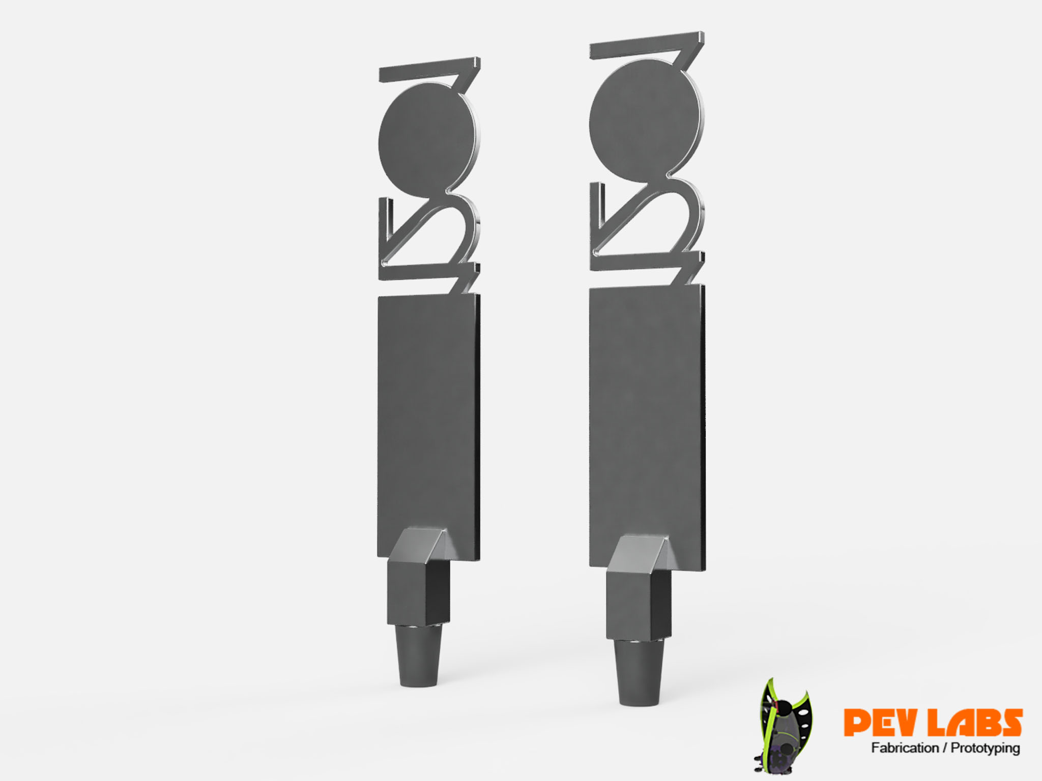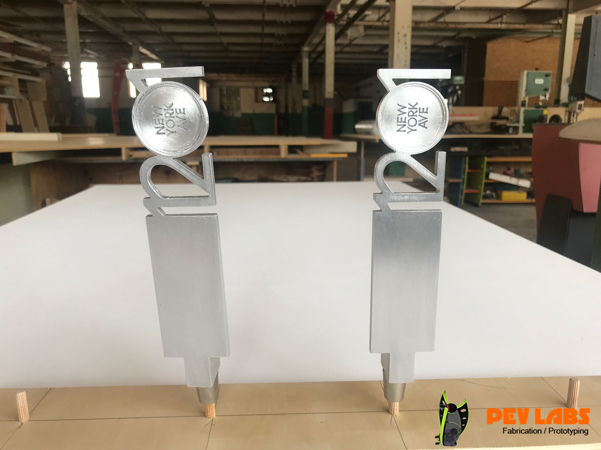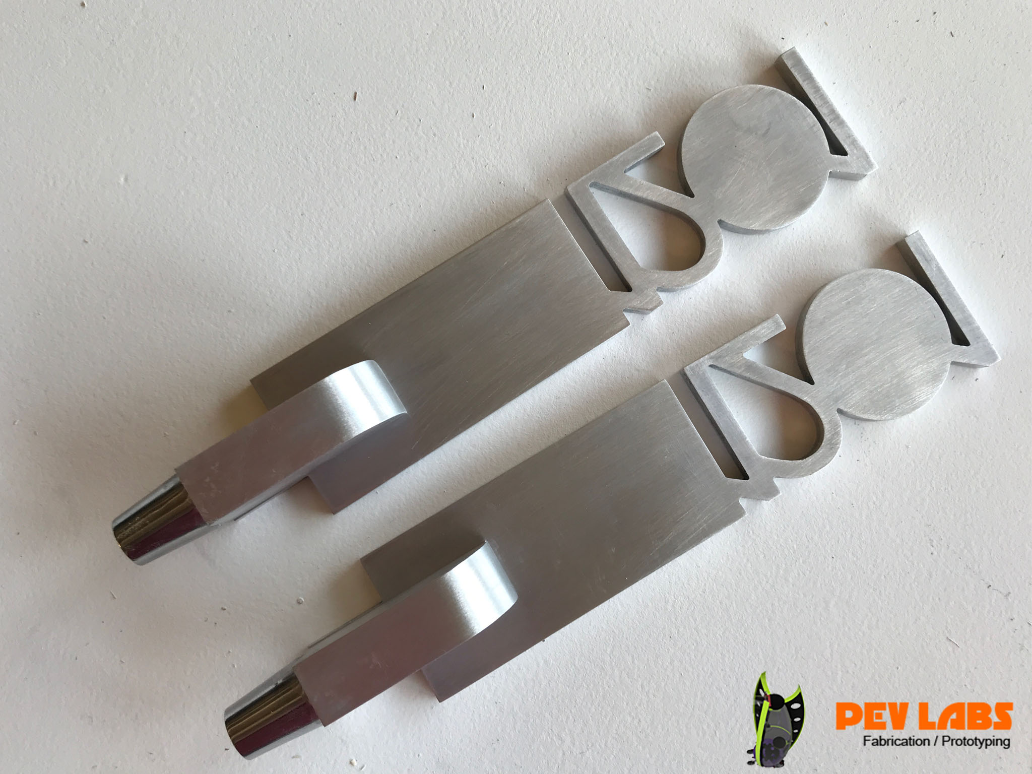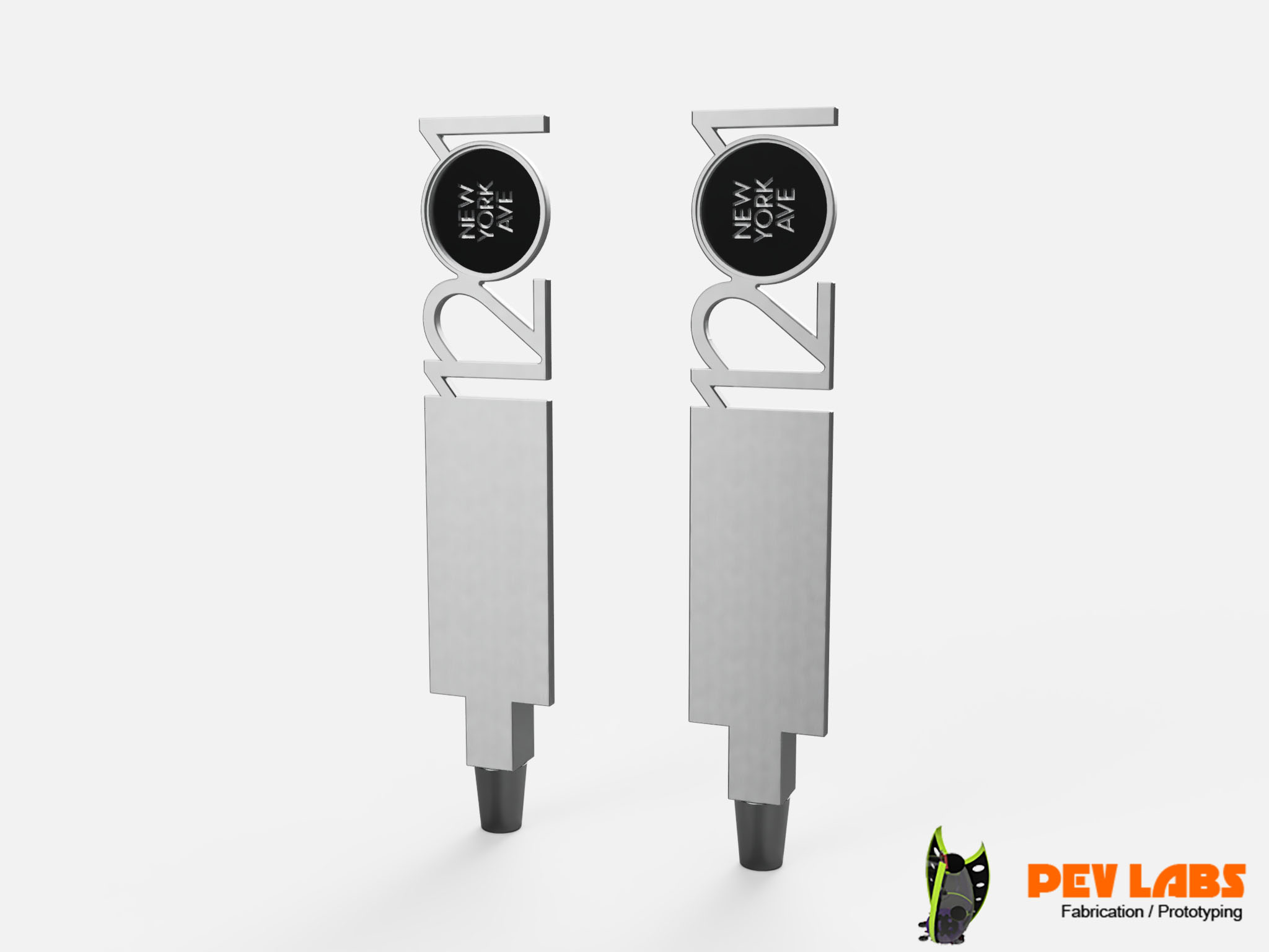 All aluminum metal tap handles produced from 0.25" aluminum plate with steel chrome ferrules. These are for an office kombucha dispenser at 1201 New York Avenue Washington DC. The beginning stages of the industrial design for this project was handled by the media agency who hired use and laid out as a vector file in Adobe Illustrator. For us the project required exporting the vector as a DXF (or SVG) file then import into Fusion 360 CAD CAM software. Within fusion we extrude the 2D file into a 3D model. We add fillets for rounding sharp edges along with the various depths needed for this particular design. We post our models live for clients to view and for them to share with their clients. The live view component of Fusion (See below) allows for the item to be spun around 360 degrees to expose all facets for inspections. Also supports zooming in for finer detail and exploding the model into various parts. Once the model is approve we provide photorealist renderings and begin production. The same model the client views is used to produce the CAM tool paths needed to drive the computer numeric controlled machinery. In this case it was a gantry style CNC machine which we used for CNC milling of aluminum.